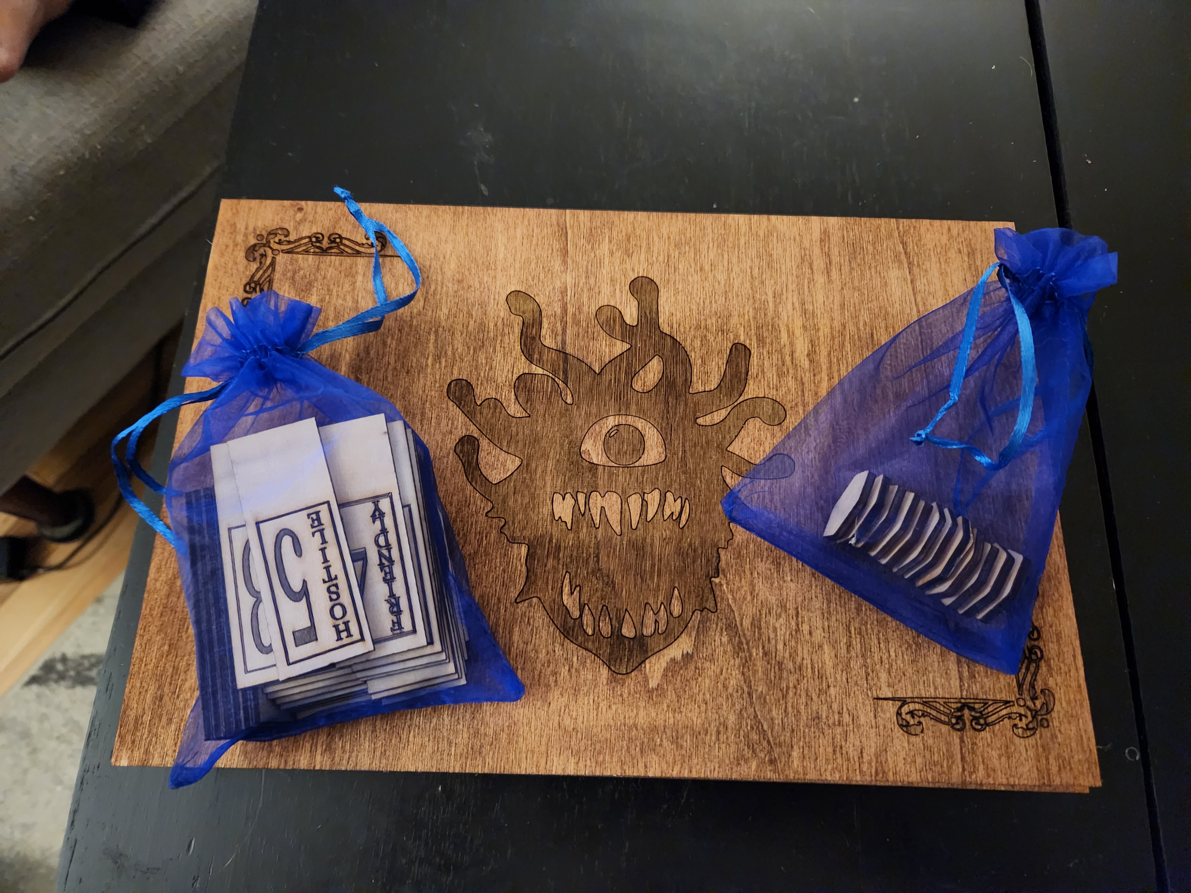 A handcrafted wooden deck box designed to hold 100 double-sleeved cards. Choose a stain color, a free engraving for the side panel, and an optional custom text engraving for the top. Custom engravings are $5.